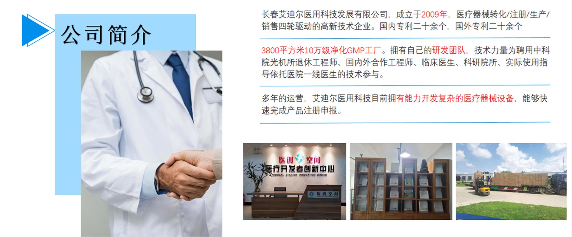 長春艾迪爾醫用科技發展有限公司為集產(自有工廠); 學(多所院??蒲姓n題合作單位);研(研發成果轉化注冊)三位一體的高新技術企業。艾迪爾科技主要經營范圍為一次性醫療器械耗材的開發,專注于抗菌肽新材料的開發和研制,以“IN-58抗菌肽一類新藥及原料藥注冊、激光類治療儀”兩個核心優勢技術為中心。公司擁有標準GMP車間及健全的質量管理體系,擁有多個已上市和即將上市的產品,包括睡眠、泌尿、口腔、肝膽、消殺、婦科六大系列產品線。公司擁有核心專業技術報批團隊,承接國內外醫療器械專項成果轉化,具備自主研發能力及MAH服務能力。
